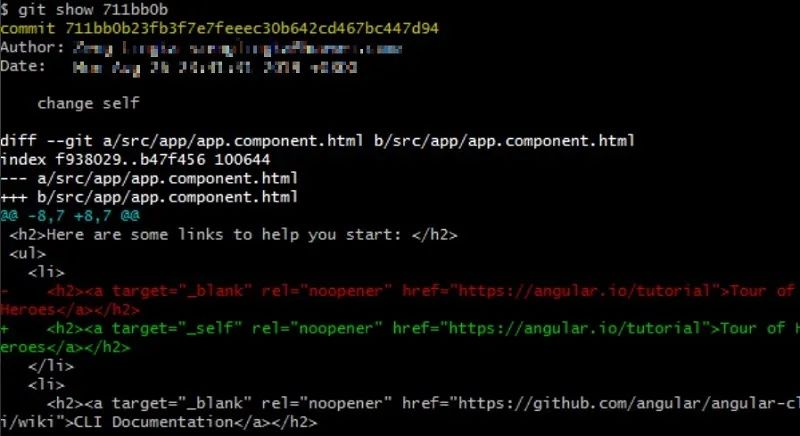 比如:Commit ID为711bb0b的提交,该次提交将标签的target属性由"_blank"改成了"_self"。