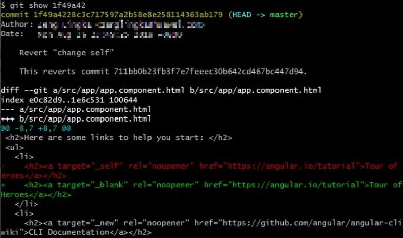 revert之后,会在提交历史的最前面生成一个新的Commit ID(1f49a42),该次提交将标签的target属性由"_self"改回了"_blank"。