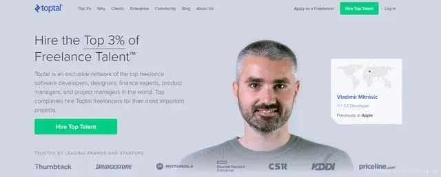 Toptal 是一个高端一些的自由职业者平台,适合比较有经验和工作尽力的远程工作者。它将企业与全球的软件工程师,设计师和业务顾问联系起来。