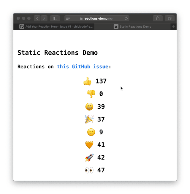 我们创建了一个示例演示了再生静态页面的过程,该页面显示了某个 GitHub 问题的各种互动的计数:
