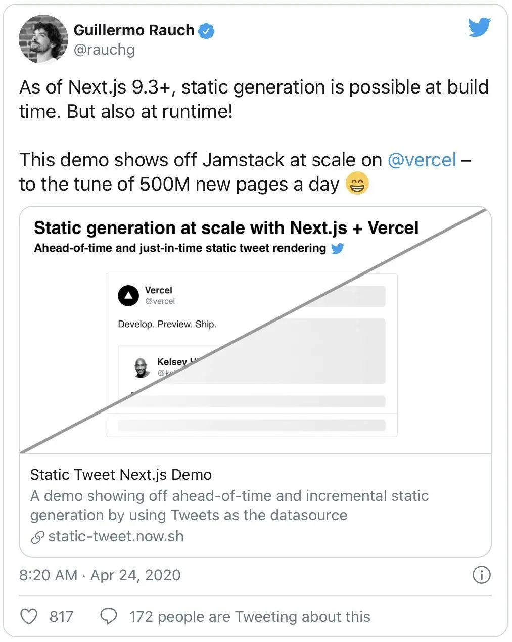 Next.js 在 9.3 版中引入了静态网站生成方法,其目标很明确:我们应该获得静态的优势(一直很快,一直在线,全局复制),但是对动态数据的出色支持也不能丢,后者是 Next.js 的看家本领。