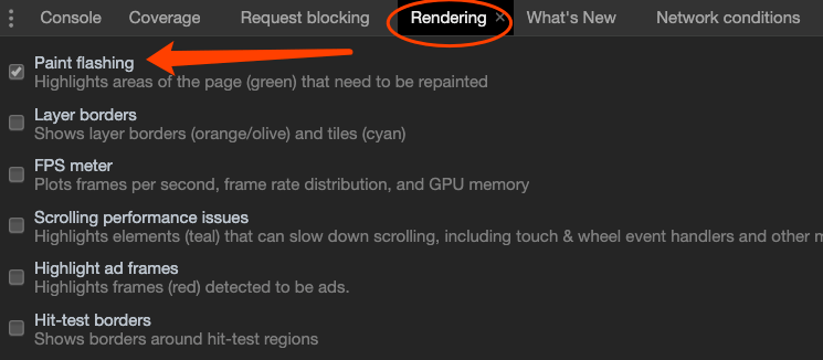 关于重渲对页面的影响,我们就不多说了。那么如何知道页面的渲染过程呢?我们可以通过 Rendering 来可视化查看。