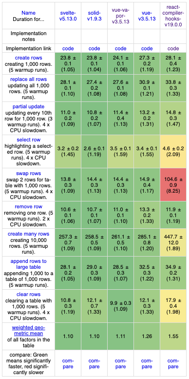 根据JS Framework Benchmark的最新结果(Chrome 138环境):