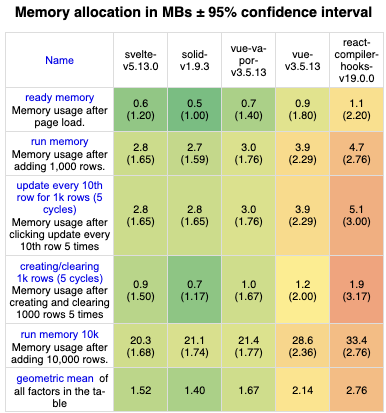 SolidJS和Svelte 5持平,成为性能第一梯队。内存优化突破性进展