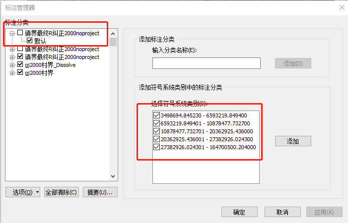 2.关键一步,打开标注管理器可以看到符号类别分类,按添加,然后逐个设置分类的标注大小