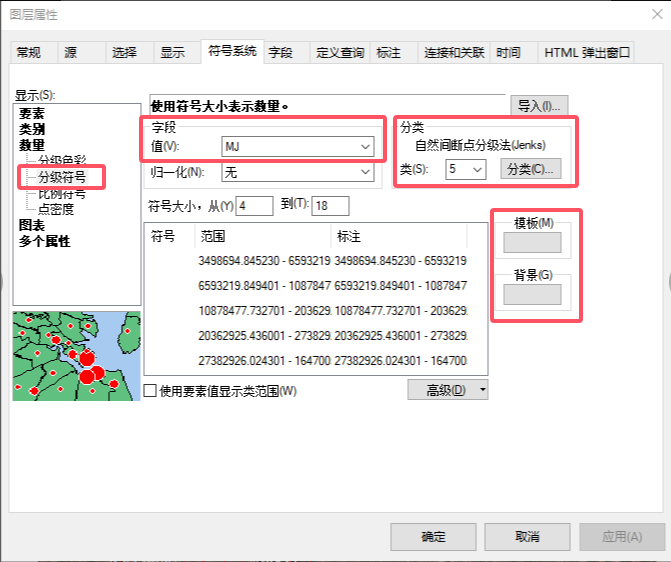 1.设置图层分级符号,根据MJ设置,如果需要更多的梯度可以增加分类数量,最后将符号的模板和背景均设置为空(编辑符号里将符号关掉)