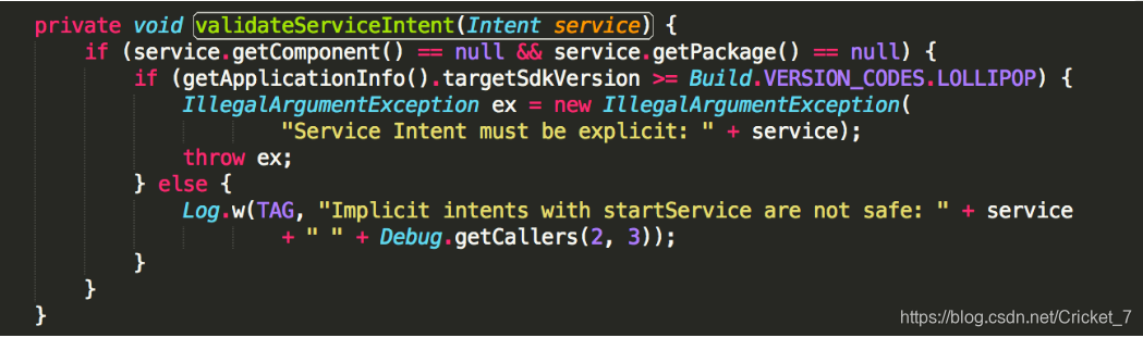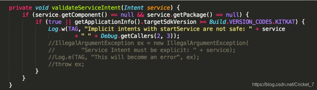 我们可以从源码中找到,这里看看Android 4.4的ContextImpl源码中的validateServiceIntent(Intent service),可知如果启动service的intent的component和package都为空并且版本大于KITKAT的时候只是报出一个警报,告诉开发者隐式声明intent去启动Service是不安全的.