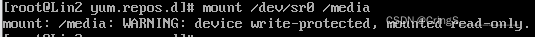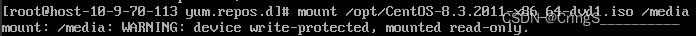 mount /opt/CentOS-8.3.2011-x86_64-dvd1.iso /media #输入到"o"时可以稍加停顿的按两次tab键进行补全,后面的media就是我们的挂载路径(注:这是云服务实训平台的挂载路径,若是VMware下则是mount /dev/sr0 /media)