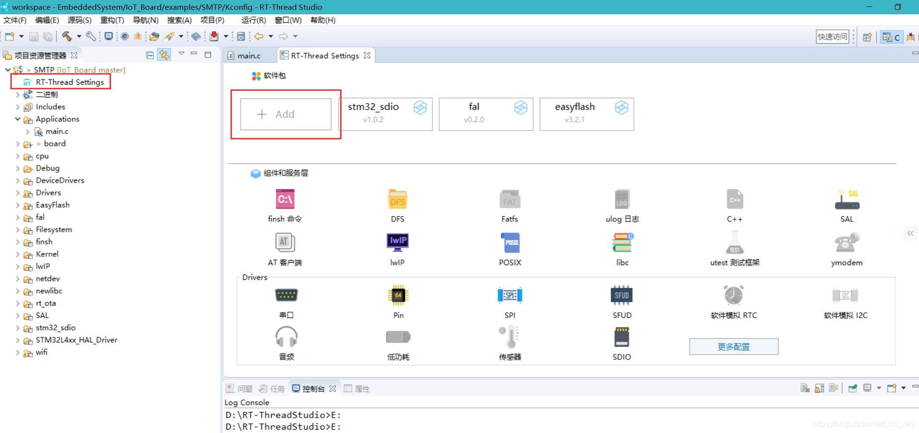 首先点击工程目录下的 RT-Thread Settings ,打开配置界面,并点击软件包下的 Add 按钮: