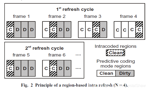 3、错误恢复,每帧中的区块都是参考其前一帧的相应位置的块。假设第一帧丢失,那么第二帧有第二条区域可以正常解码,第三帧的第二条参考第二帧的第二条,那么第三帧的第二条和第三条可以正常解码依次类推,一个GOP期内可以恢复回来。