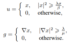 基于半二次分裂L0极小化法[1],提出使用一种有效的交替最小化方法。引入辅助变量u和g=(gh,gv)T 并重写(4)为