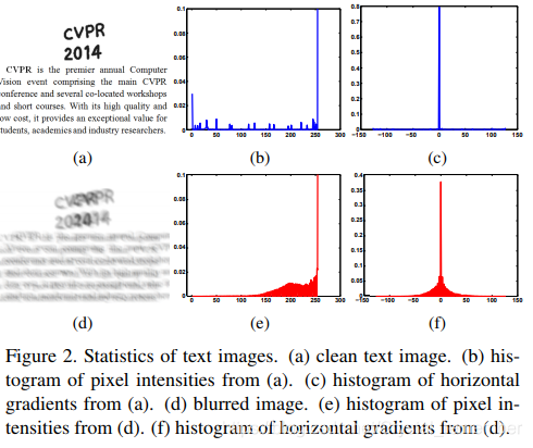 观察下图,b e分别为清晰图像a和模糊图像d的像素强度直方图,c f分别为清晰图像a和模糊图像d的水平梯度直方图,基于他们之间差异,提出L0正则先验去噪。