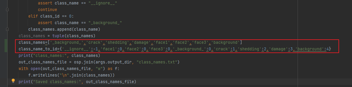 如果我们不需要face1,face2,face3,从上面中删除face1,face2,face3会报错。我们只需要将如下代码添到labelme2voc.py中的class_names = tuple(class_names) 下面,即可达到忽略face1,face2,face3的目的。此时修改labels.txt操作变得可有可无了。