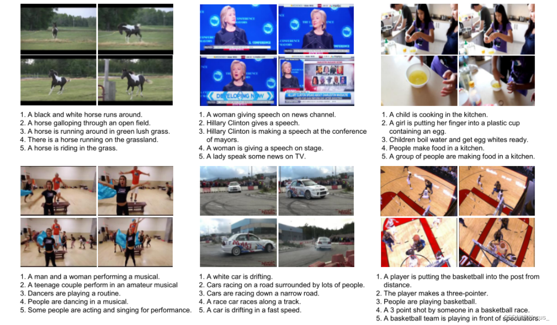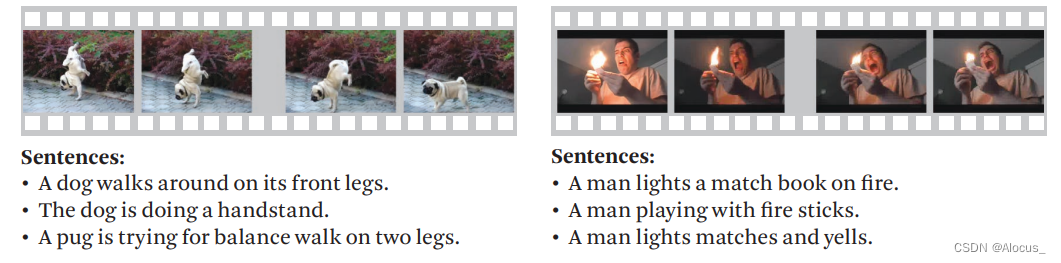 MSVD包含1970个视频,每个视频片段有40个字幕。每个视频片段的平均持续时间约为10秒。常见情况下,包括使用1200个视频进行训练,100个视频进行验证,670个视频进行测试。数据集示例如下。