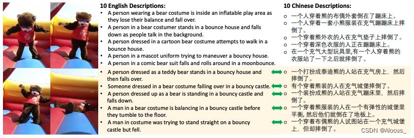 每个视频具备 10 个英文描述和 10 个中文描述,分别来自 20 个人类标注者。所有这些都描绘了相同的视频,因此彼此之间是平行的,而最后五个是彼此成对的翻译。