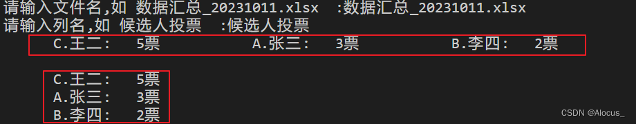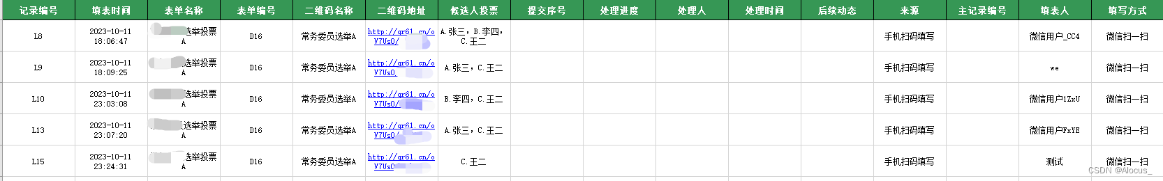 我们的草料二维码导出的xlsx文件如下图所示,目标是统计出列名为候选人投票下的内容中每个人的票数。