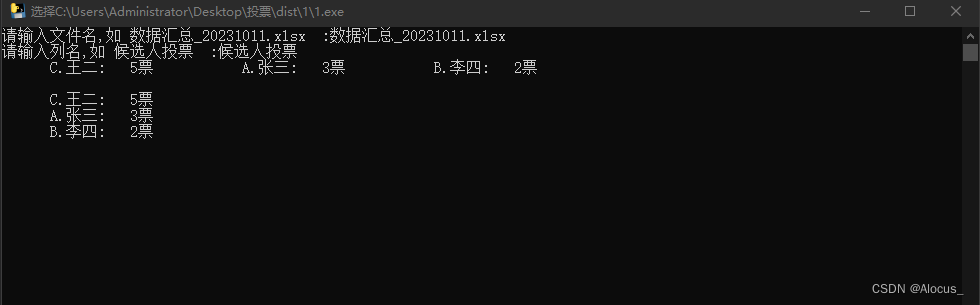 草料二维码能够比较方便地进行发放问卷、调查、投票等。但是,对统计后的数据缺乏自动统计功能。导出xlsx或csv文件后,手工统计票数太慢。因此,利用pandas等包对文件自动统计并显示,能降低工作量。为了方便使用,将其打包为exe文件。具体如下。
