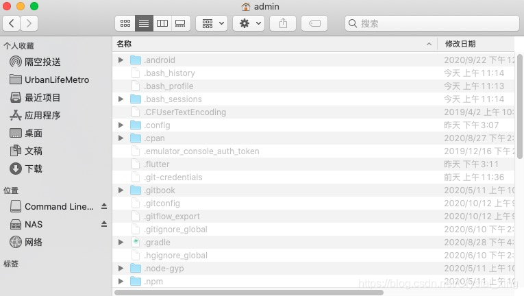 先前往->个人,看看home user根目录有没有bash_profile文件(下图中第三个文件),有的话直接双击打开修改即可,没有的话先用touch命令创建文件:touch ~/.bash_profile