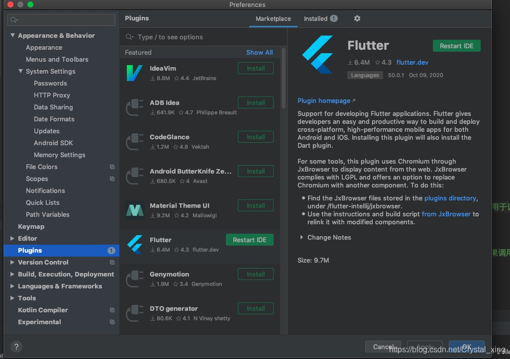 1. AndroidStudio->preferences->Plugins, 搜索到Flutter插件点击安装,然后重启IDE