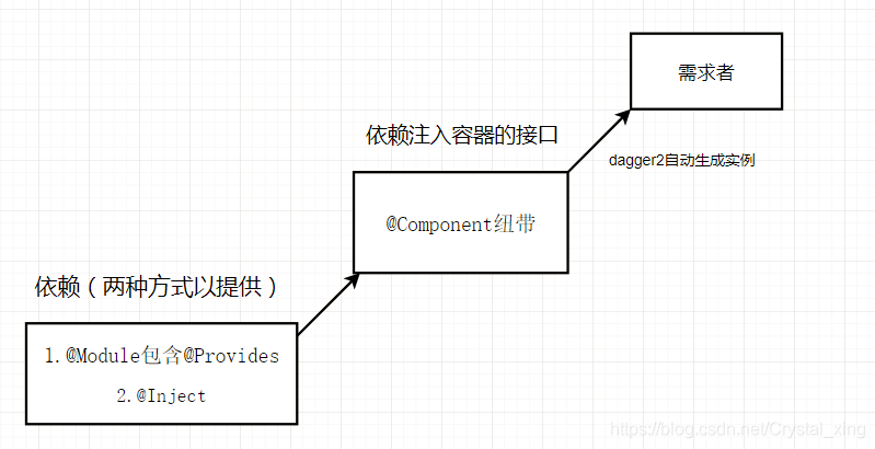 依赖一般有2种方式,一是通过@Inject构造函数的方式提供,二是通过Module的方式提供。但是光有依赖和需求者是不够的,必须有一个纽带来维系才能让Dagger2正常的工作。