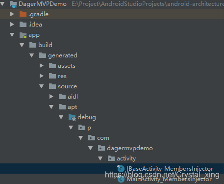 注意在构造函数上也有 @Inject的标识,这说明了告诉了Dagger2框架Presenter的身份是一个依赖。当build项目后可以在编译生成的文件中查找到Dagger2生成的文件,其中以_MembersInjector结尾的就是上面所说的注入器,然后就能在页面代码进行依赖注入的操作:
