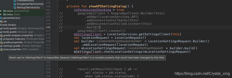 本文探讨了Kotlin中Nullable类型引发的Smartcast错误,包括错误的原因及解决方案,如使用val进行中间周转和调整代码结构。同时,提到了在使用Google Service Location时遇到的类似问题及其解决方法。