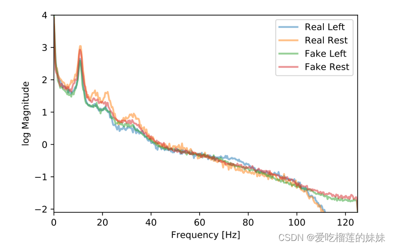 为了研究CONV-CUB生成的信号的特定类别属性,我们使用初始分类器来确定被分类为属于任一类别的信号,准确率>90%。同样地,我们用同样的方法来确定表现为任一类别的概率>90%的真实信号。图6中显示了各自频率谱的比较。被归类为左手运动的生成信号与真实信号中阿尔法和贝塔活动的减少相匹配,直到40Hz左右。生成的左手信号虽然没有表现出在真实的左手信号中存在的高伽马活动信号的增加。