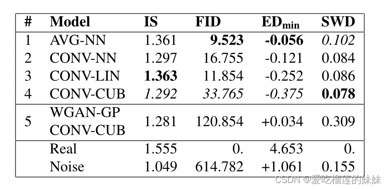 表2。不同体系结构的GANs的结果。VG表示平均池化,CONV跨步卷积表示下采样。NN为最近邻上采样,LIN为线性插值,CUB为三次插值。除WGAN-GP外,其余模型均采用本方法训练。WGAN-GP在训练中崩溃。最好的分数用粗体标出,最差的分数用斜体字体标出。