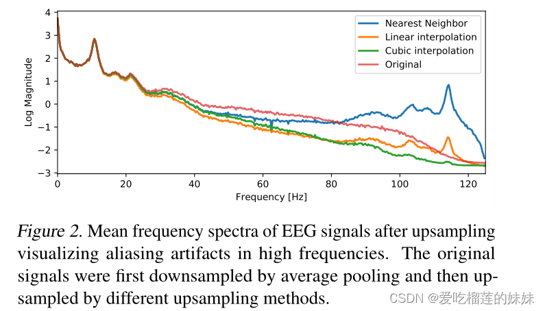 图2 高频混叠伪影上采样后脑电图信号的平均频谱。首先对原始信号进行平均池化下采样,然后采用不同的上采样方法进行上采样。