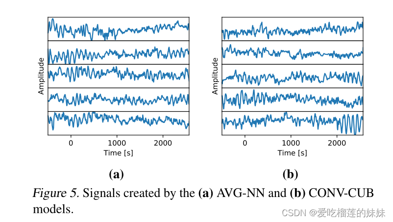 图5为A VG-NN和CONV -CUB生成的随机样本。这两个模型都是可视化生成的声音信号。信号之间的一个显著区别是convc - cub通常只生成包含弱振荡序列的信号。当通过与真实信号进行视觉比较时,这些序列对假信号具有高度指示性。