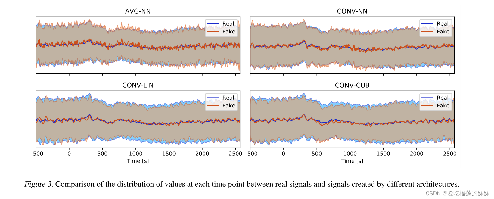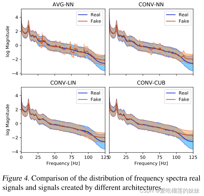图3显示了由我们的模型训练的4个架构创建的信号与真实信号的平均值和标准差。样本在每个时间点的相似性从体系结构1增加到体系结构4。而VG-NN显示出生成的样本分布与真实数据的明显偏差,CONV -CUB显示出非常好的拟合。