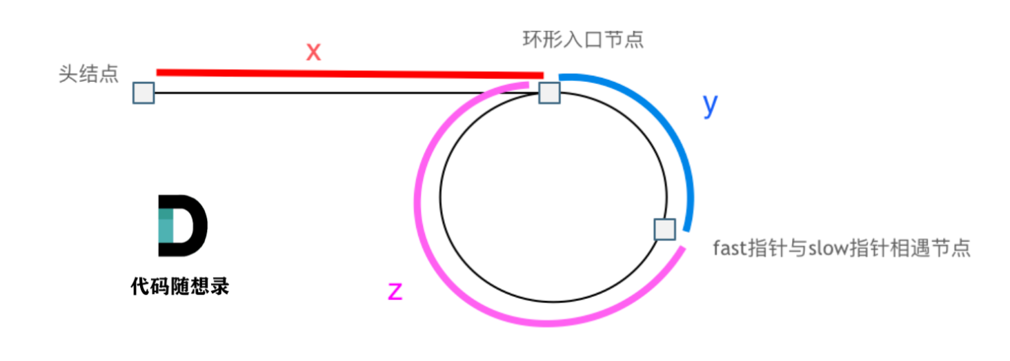 今天学习如何在环形链表中寻找环的起点节点,学习使用快慢节点遍历环形列表,并且理解其中存在的数学规律,这是我认为在计算机算法中比较难得一点,当然今天最令人印象深刻的当属这张图了: