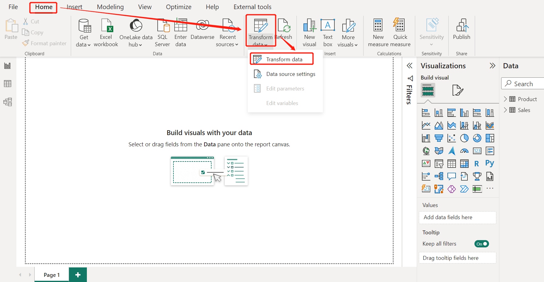 2, 【Home】 -> 【Transform data】 -> 【Transform data】;