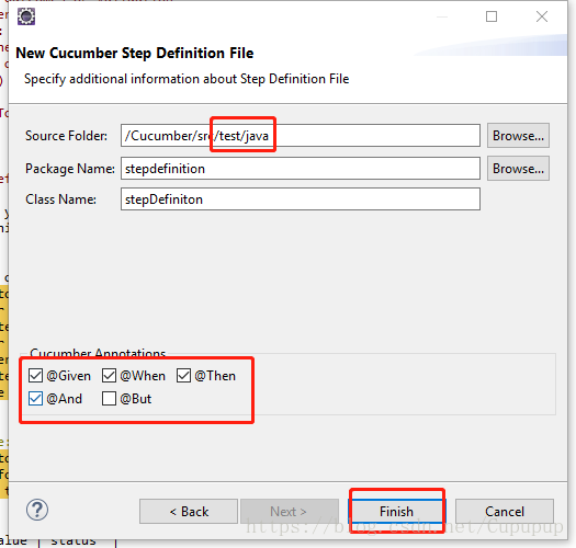 Cucumber的Step-definition和其他的java格式文件基本相同,但是在创建时可以根据需要选择性勾选并自动添加Give、When、Then、And、But注释。