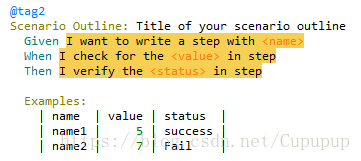 - Scenario Outline:一个.feature文件可以有0个或多个Scenario Outline关键字。用于场景中有多组数值时,必须配合Example一起使用,成对出现。