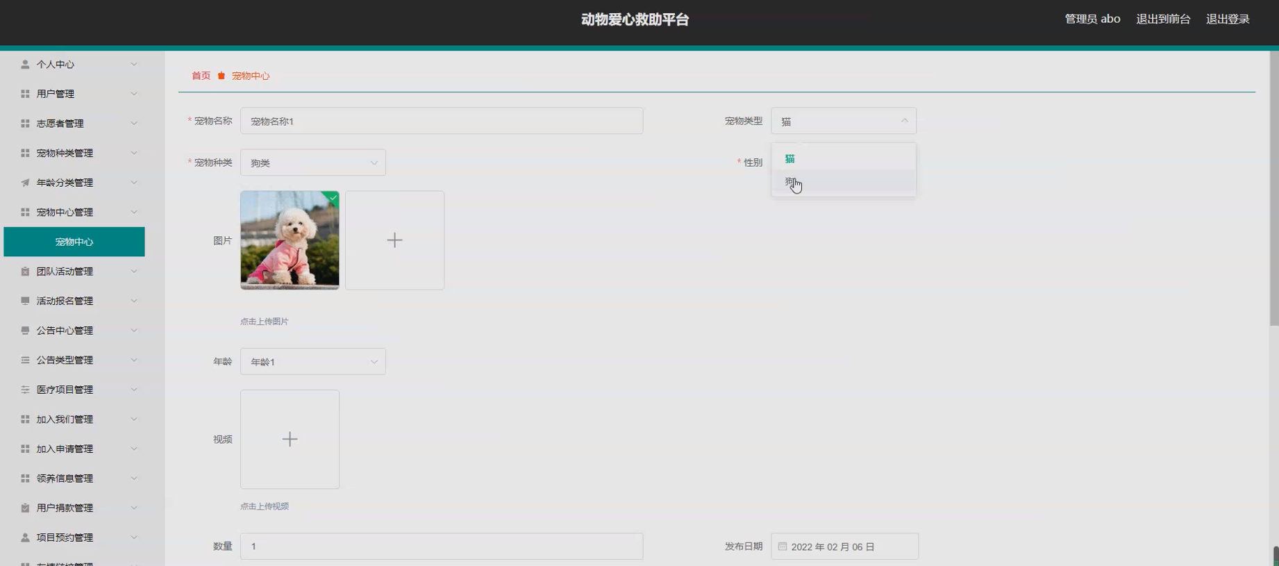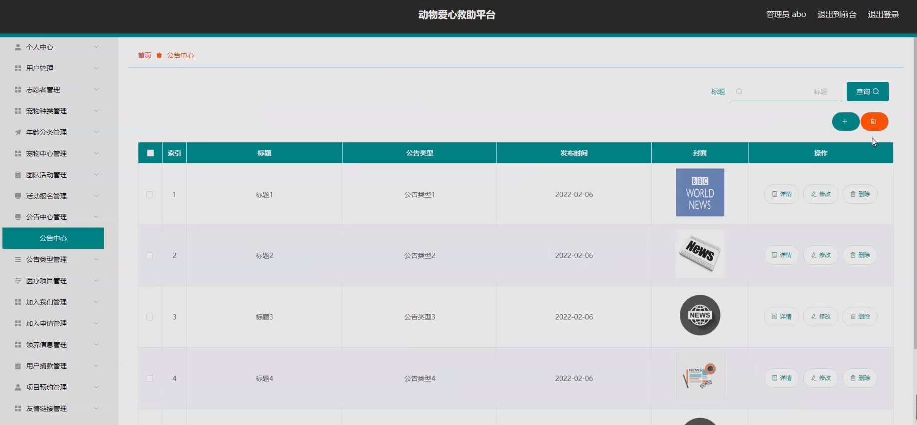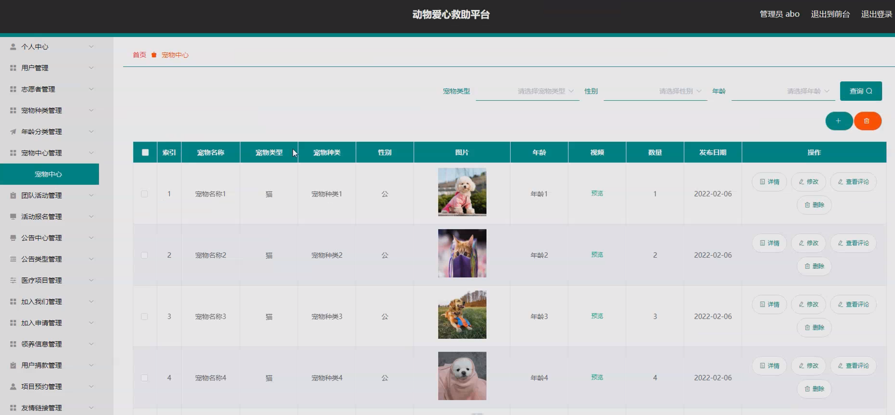 - 宠物信息管理:宠物中心可以通过平台发布待救助或待领养的宠物信息,包括动物品种、类型、流浪动物信息等。每个动物都有详细的档案,如照片、性别、年龄、健康状况等。平台支持动物信息的添加、修改、查询和删除操作。