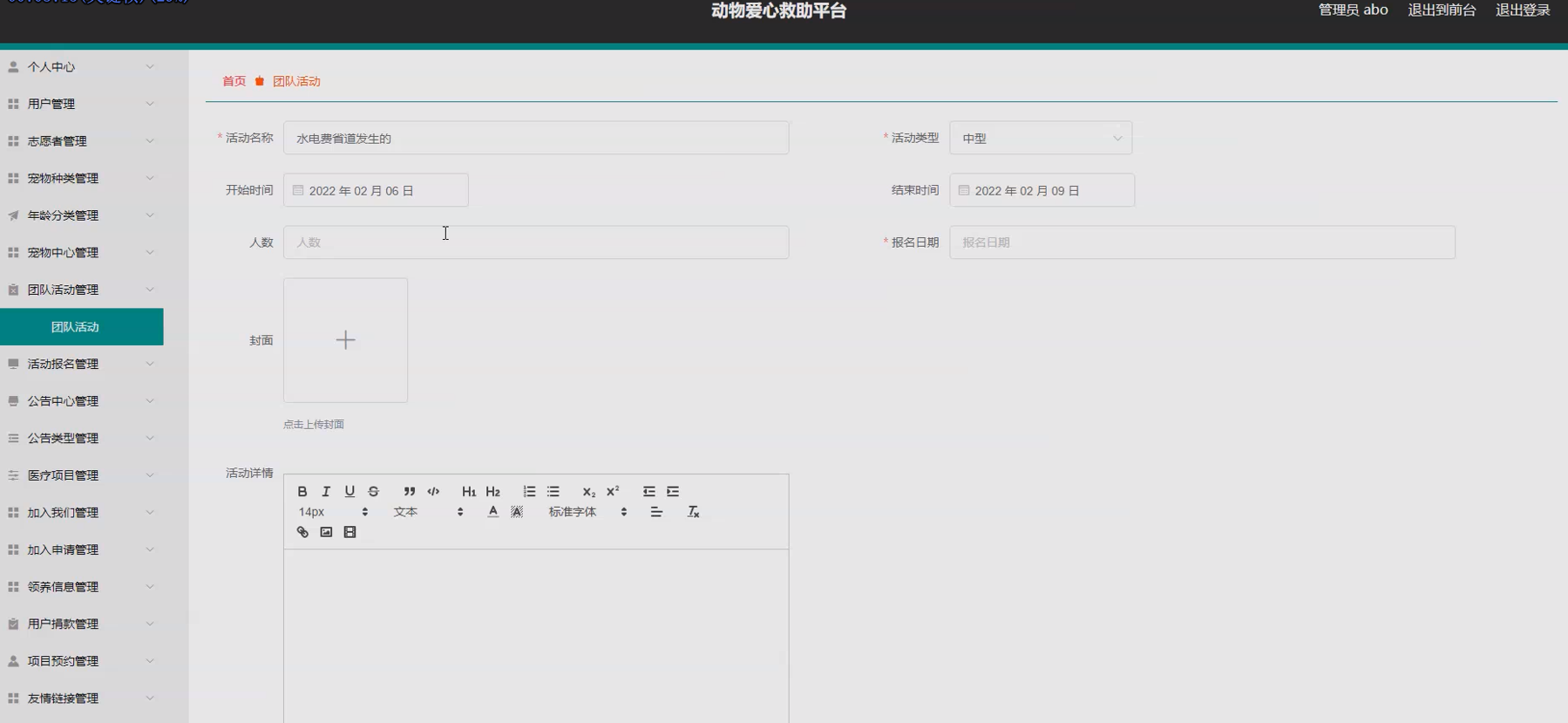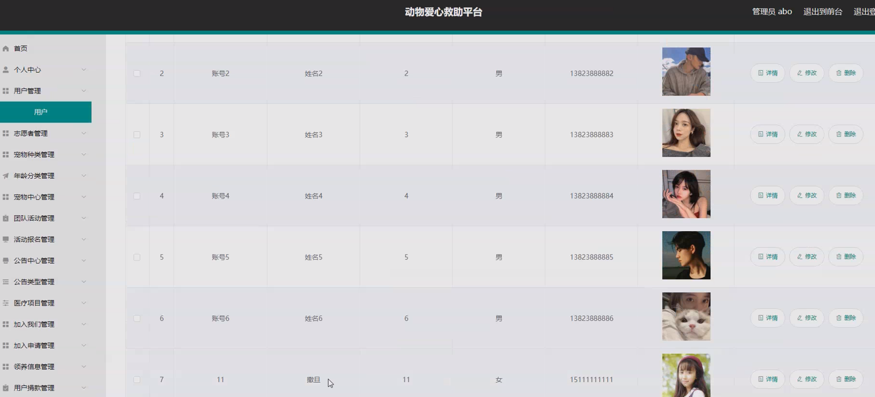 - 用户管理:包括用户注册、登录、信息修改等功能。根据用户类型(救助者、领养者、志愿者等)提供不同的权限和服务。