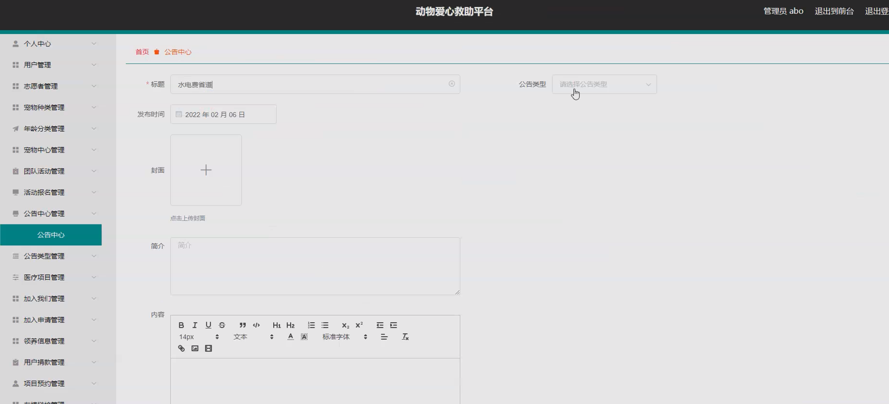 - 医疗项目管理:宠物医疗信息的发布和管理,包括救助流程的规范化、救助资源的整合,如救助机构、志愿者、医疗资源等的调配。