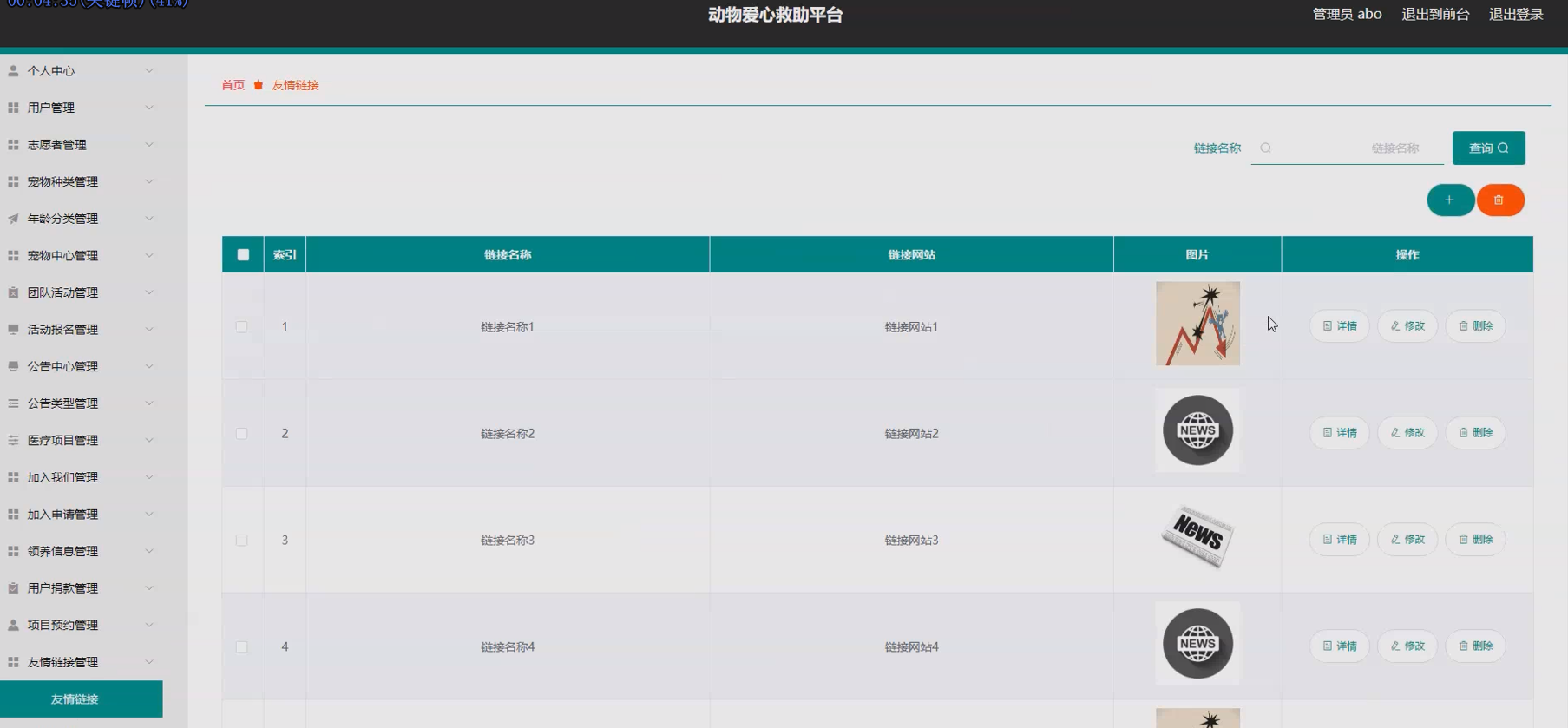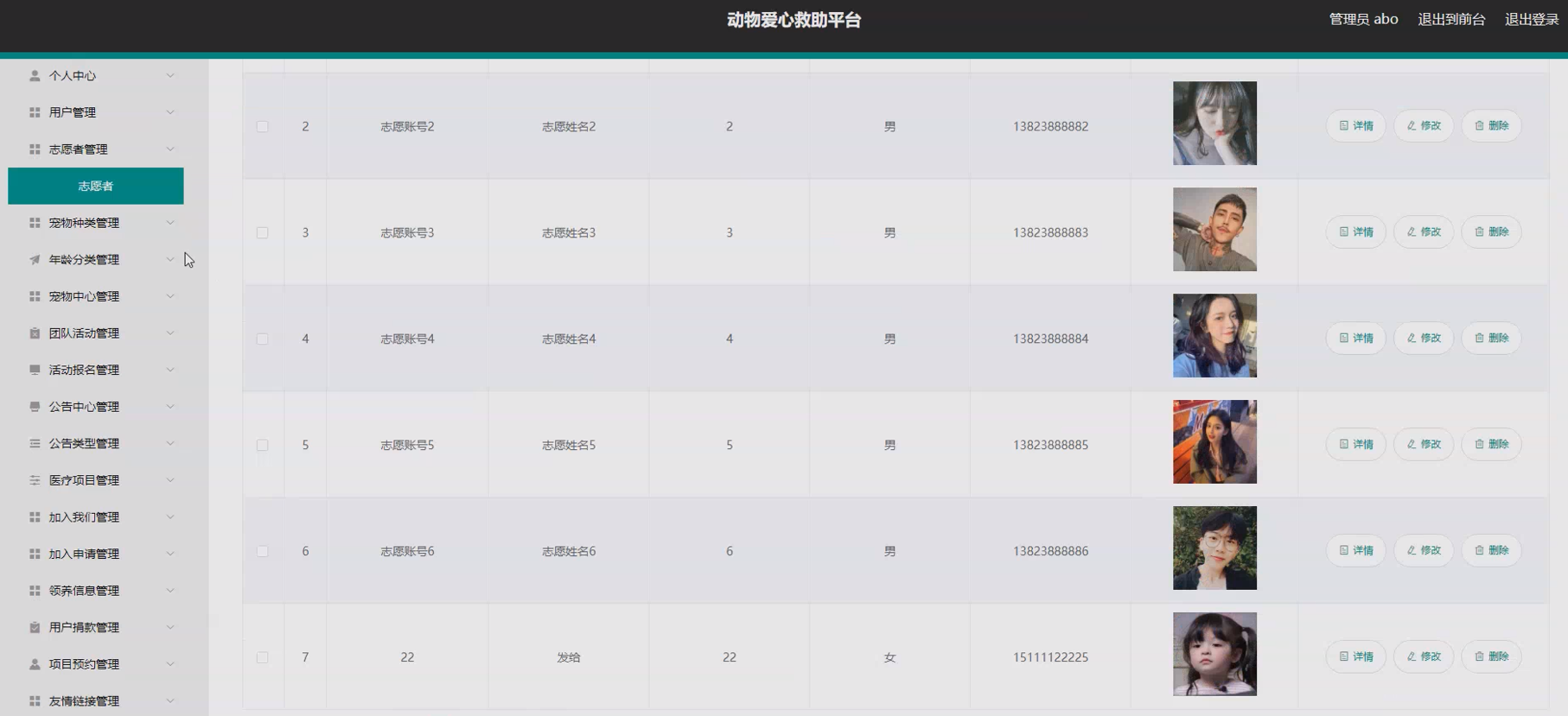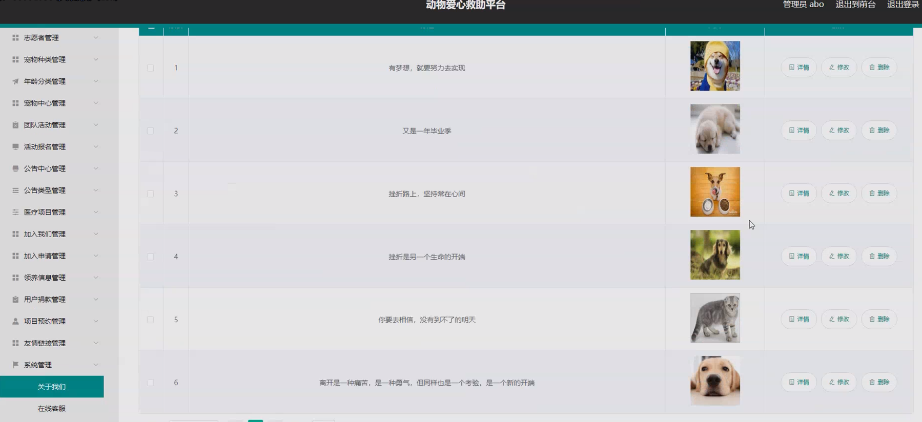 - 开发出一个功能完善、操作简便的动物爱心救助平台,包括用户管理、宠物信息管理、志愿者管理、捐款管理、医疗项目管理、领养信息管理等功能模块。