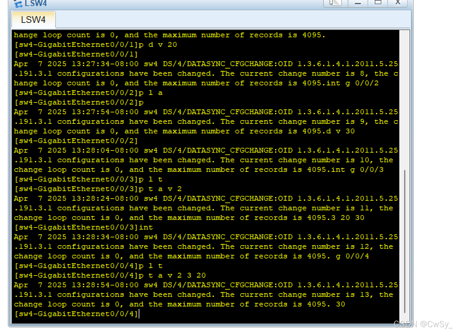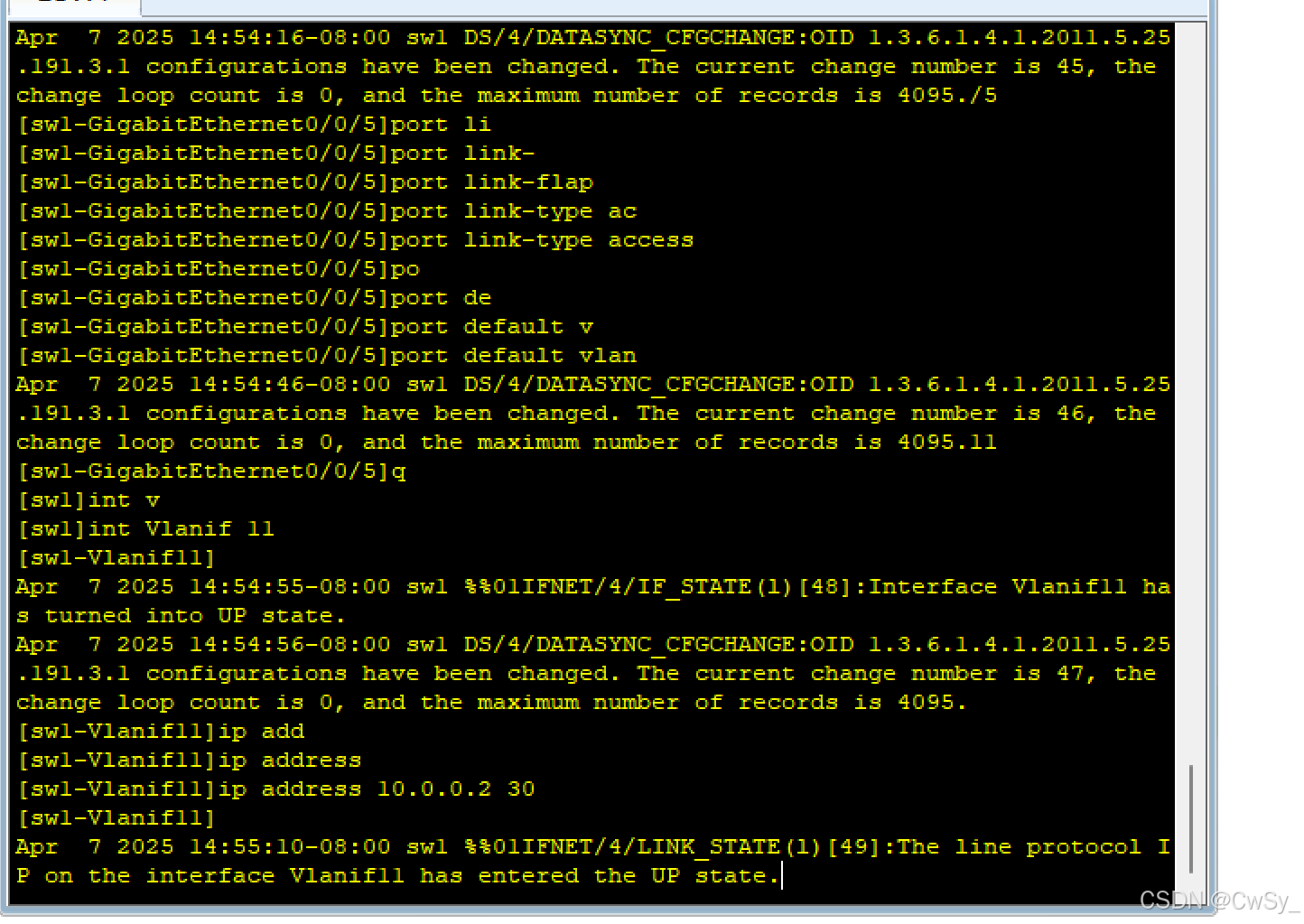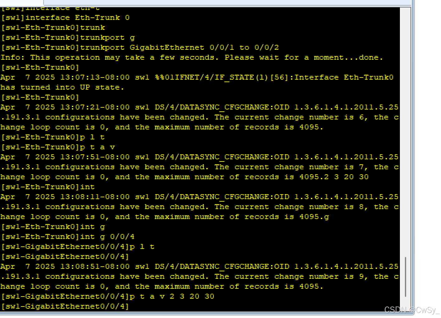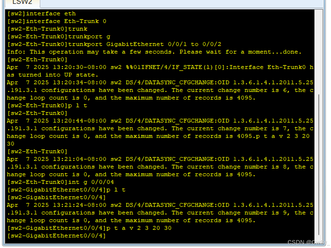 (1)创建VLAN,放通链路。其中SW1和SW2的0/0/1和0/0/2接口不能单独放通,会导致有一条链路会阻塞,需要进行链路聚合,将这两条链路逻辑上捆绑成一条链路。(配置要求是链路接口不能有任何配置)。