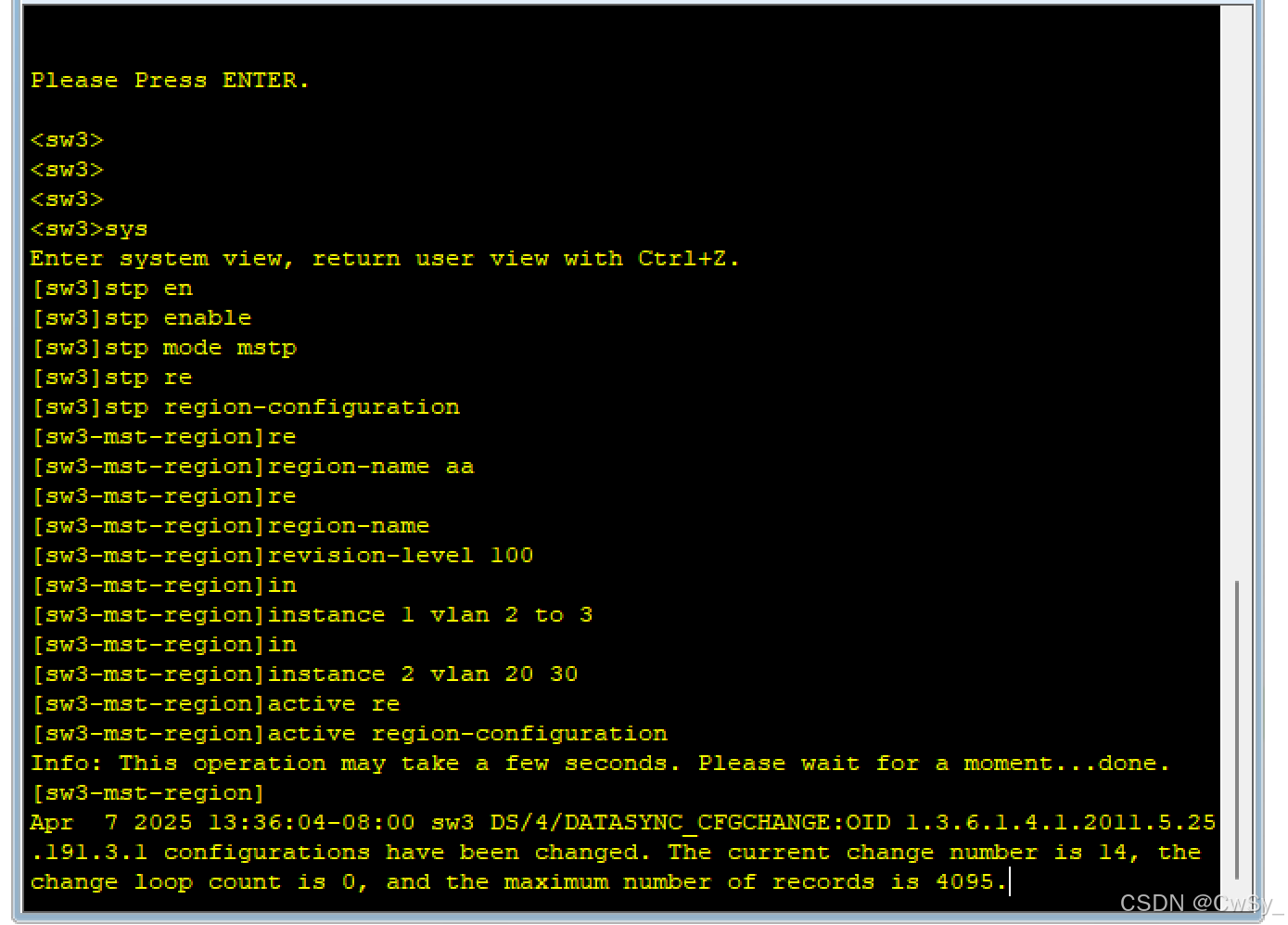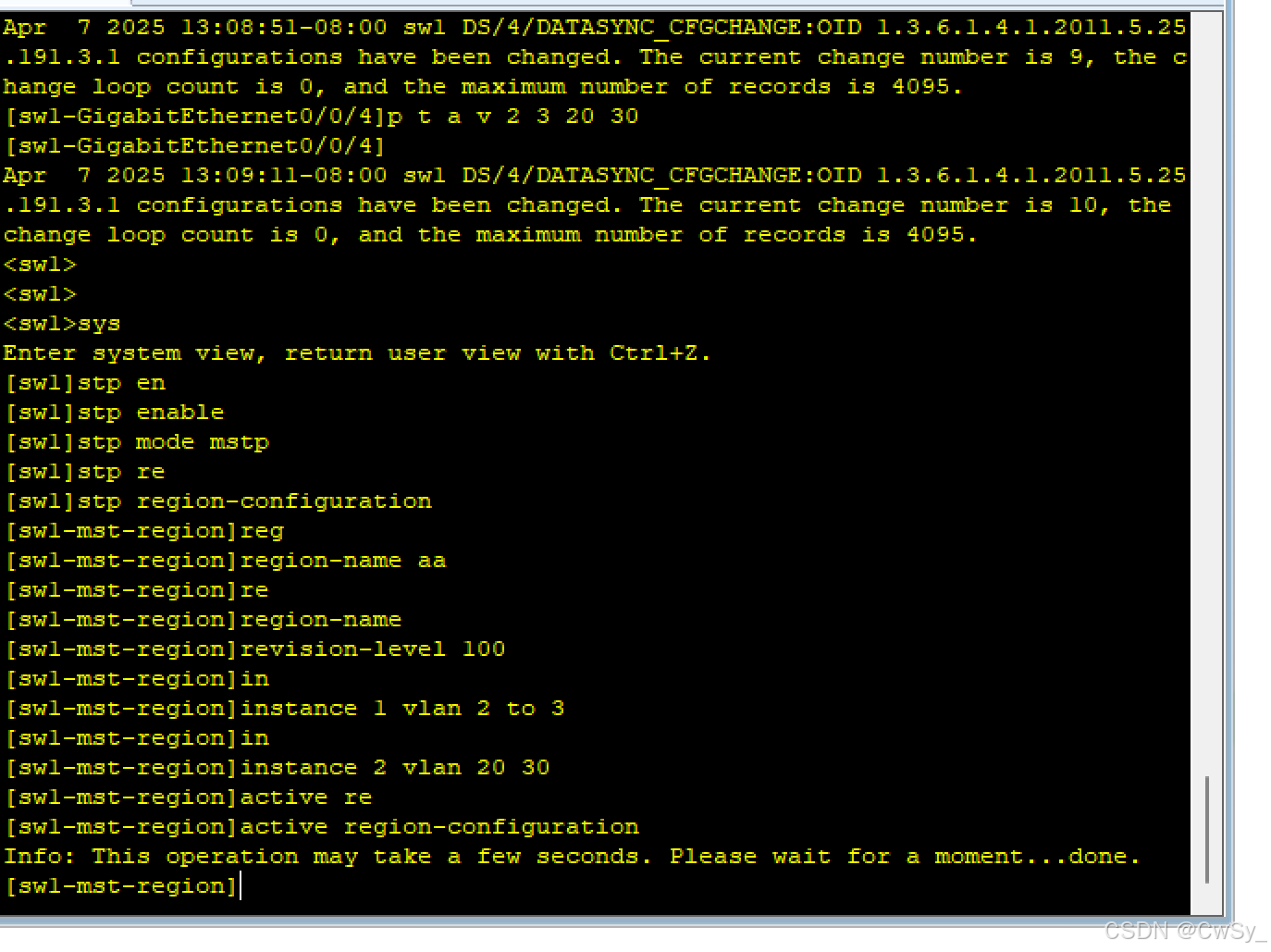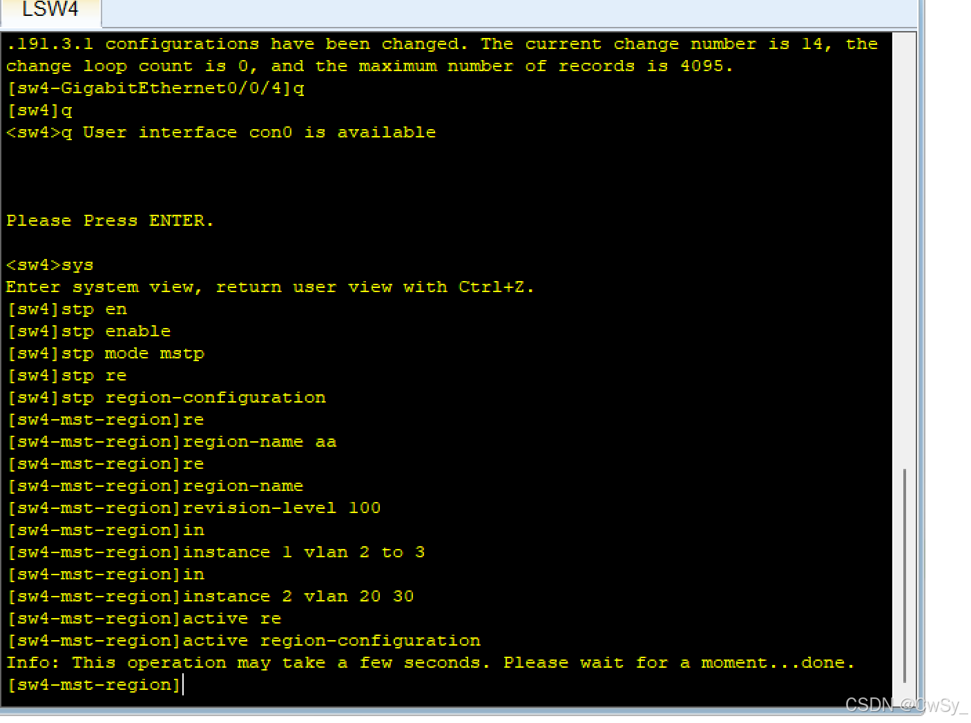 (2)让四台交换机认知到mstp内容,两条链路互为备份。