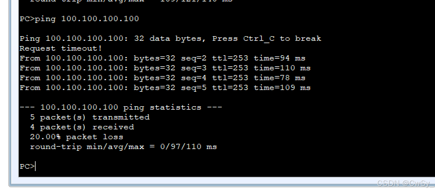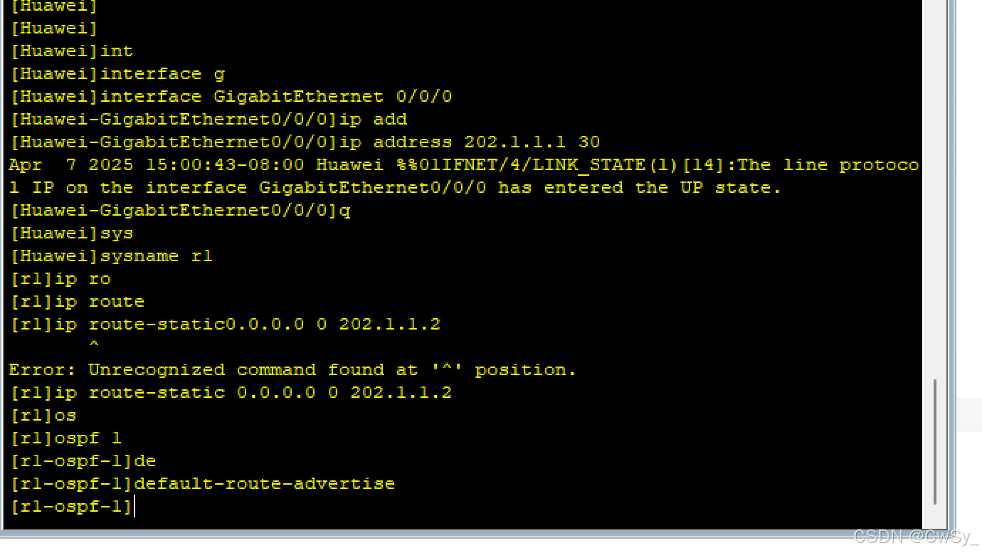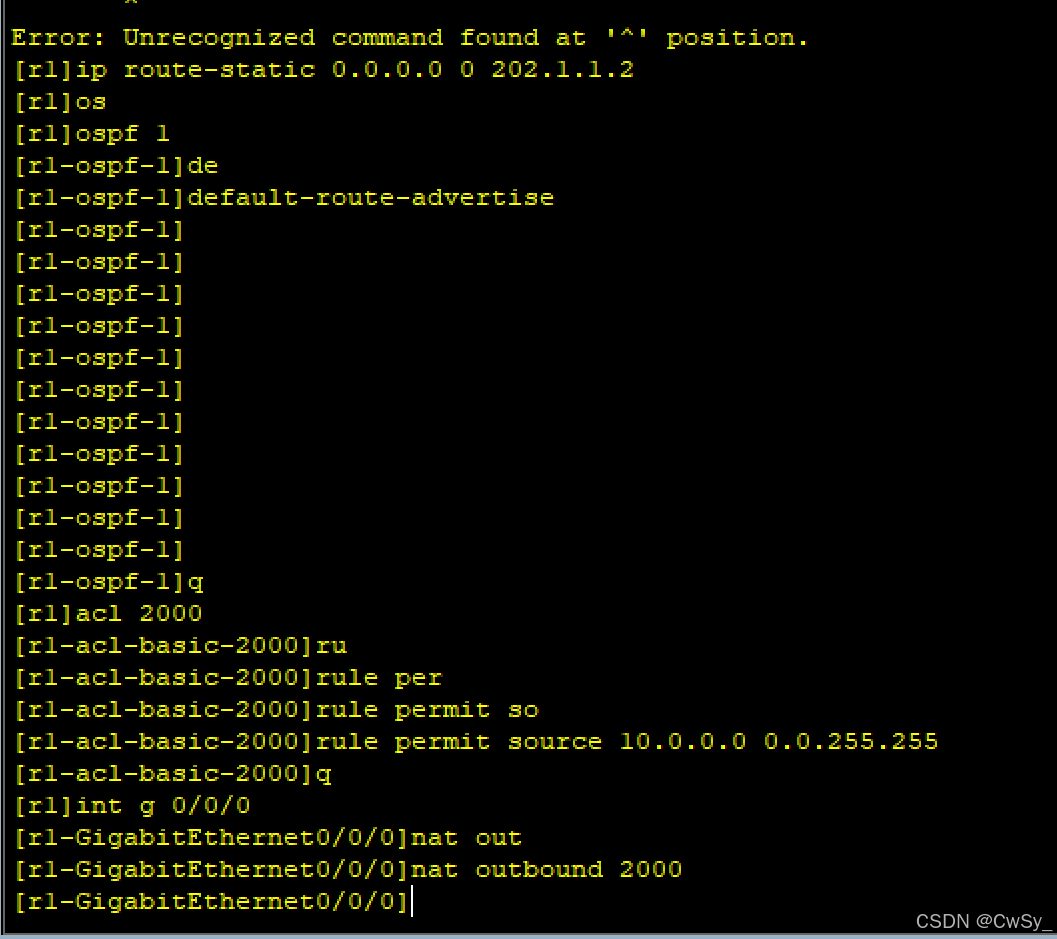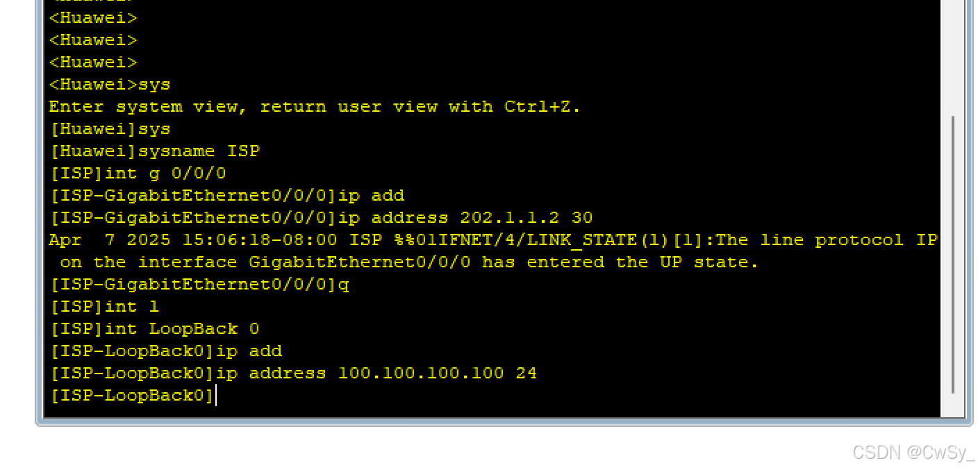 (8)先给AR1和ISP之间的链路接口和ISP的环回接口配置IP地址。AR1既作为核心层,又作为边界设备,需要写一条缺省路由指向运营商,保证成功访问外网,并配置NAT,使企业内网(私网)和运营商(公网)连通。在PC1 ping ISP的环回接口,检测连通性,实现全网可达。
