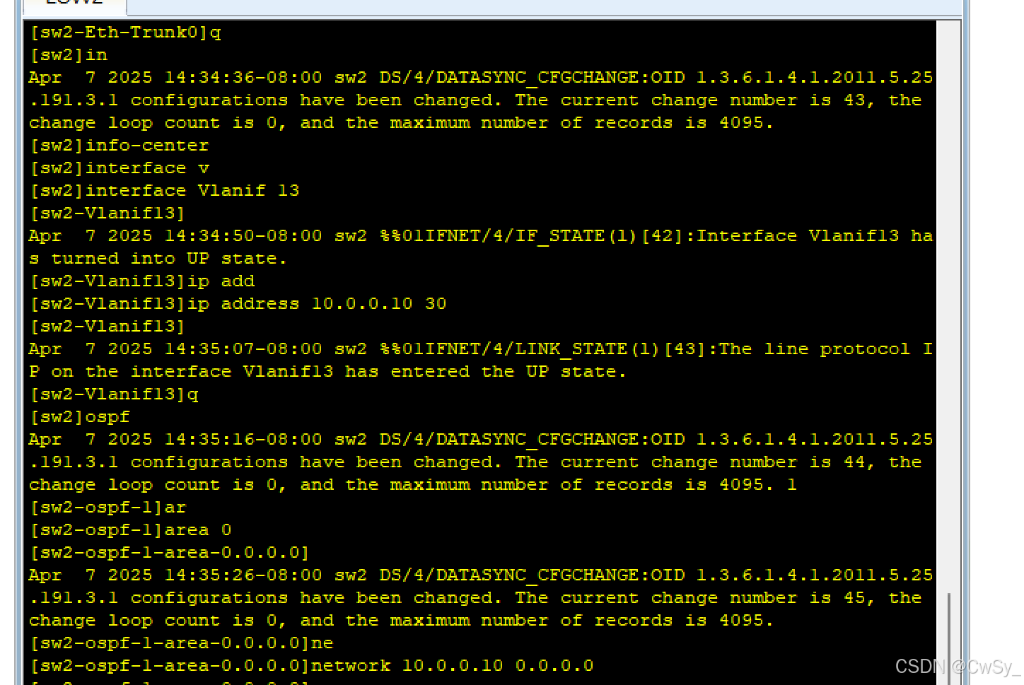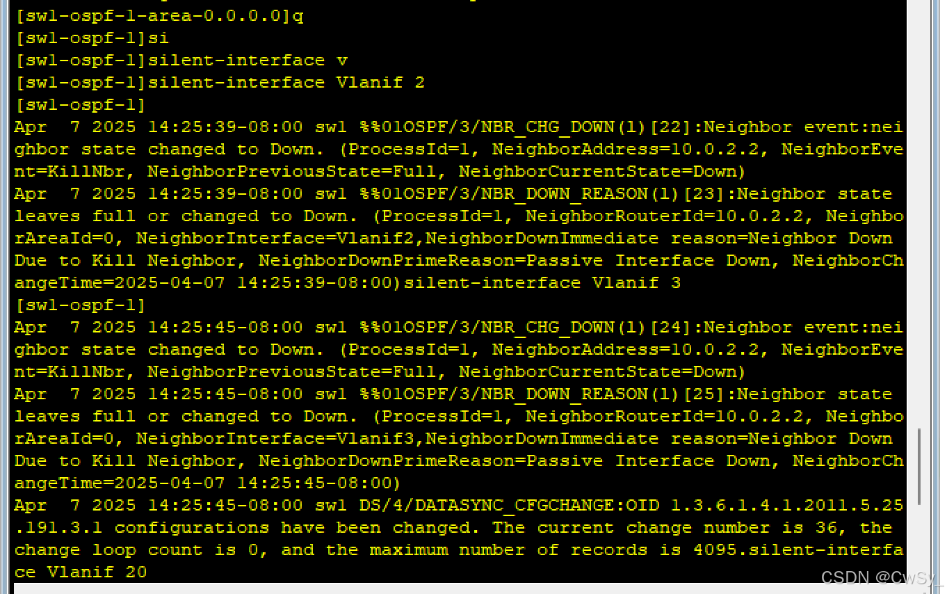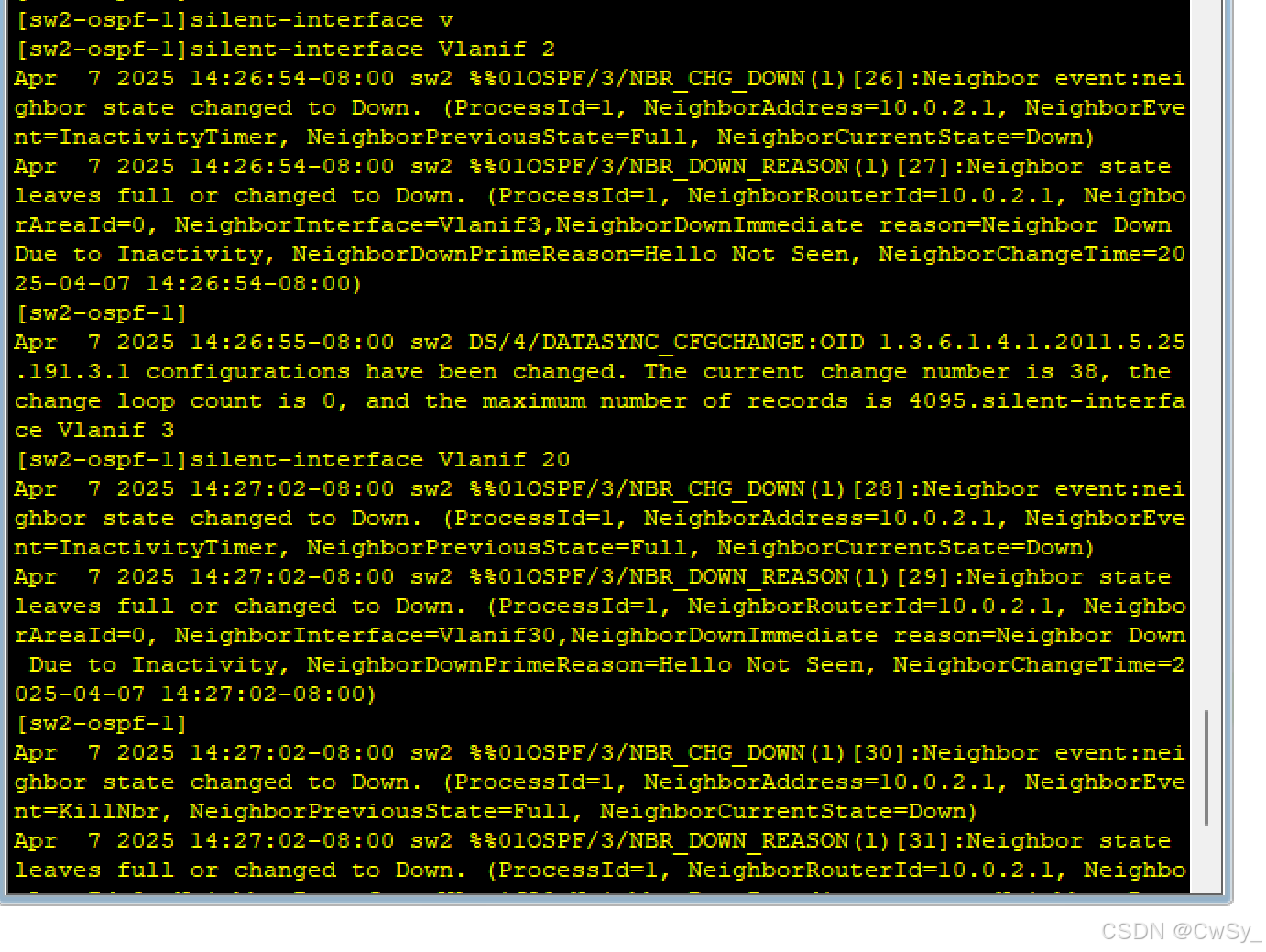 (6)SW1和SW2分别宣告对应的五个接口,AR1宣告两个接口。让四个Vlanif接口成为静默接口(接口不允许发送和接收OSPF报文)。在SW1和SW2之间的链路配置VLAN,并放通链路、宣告。