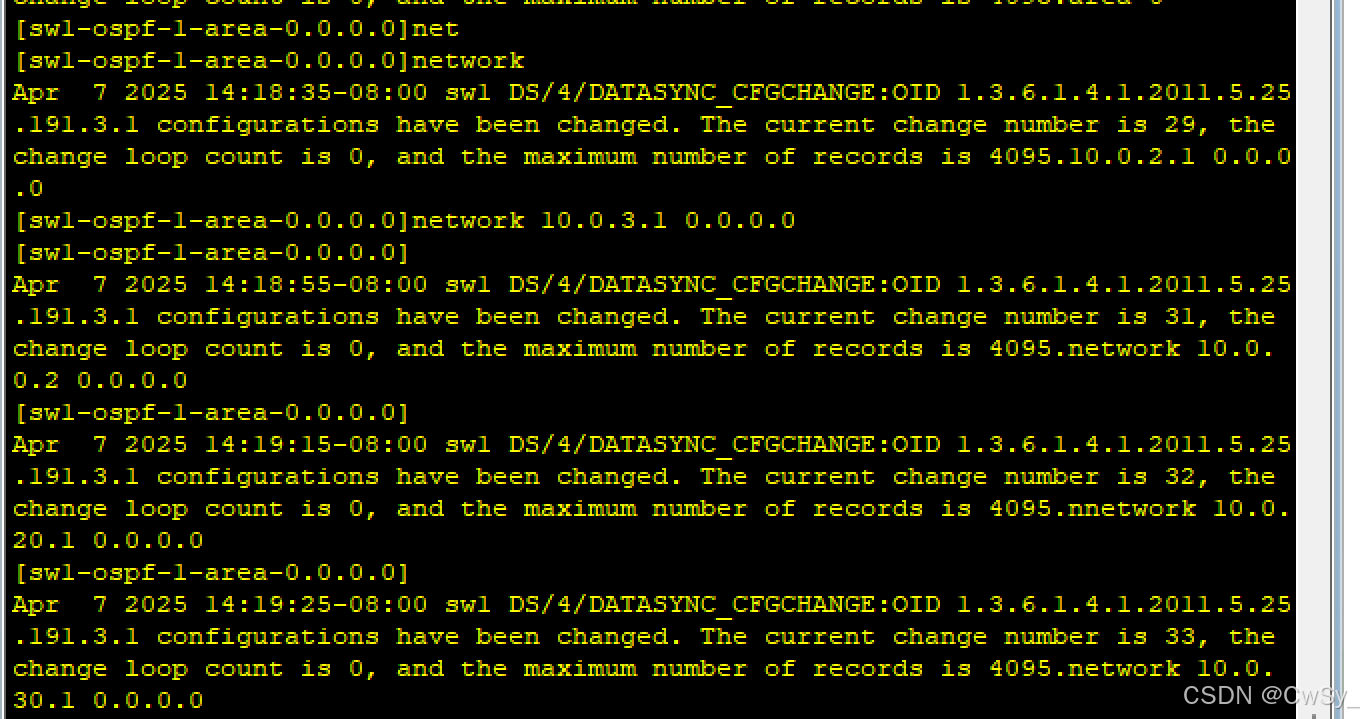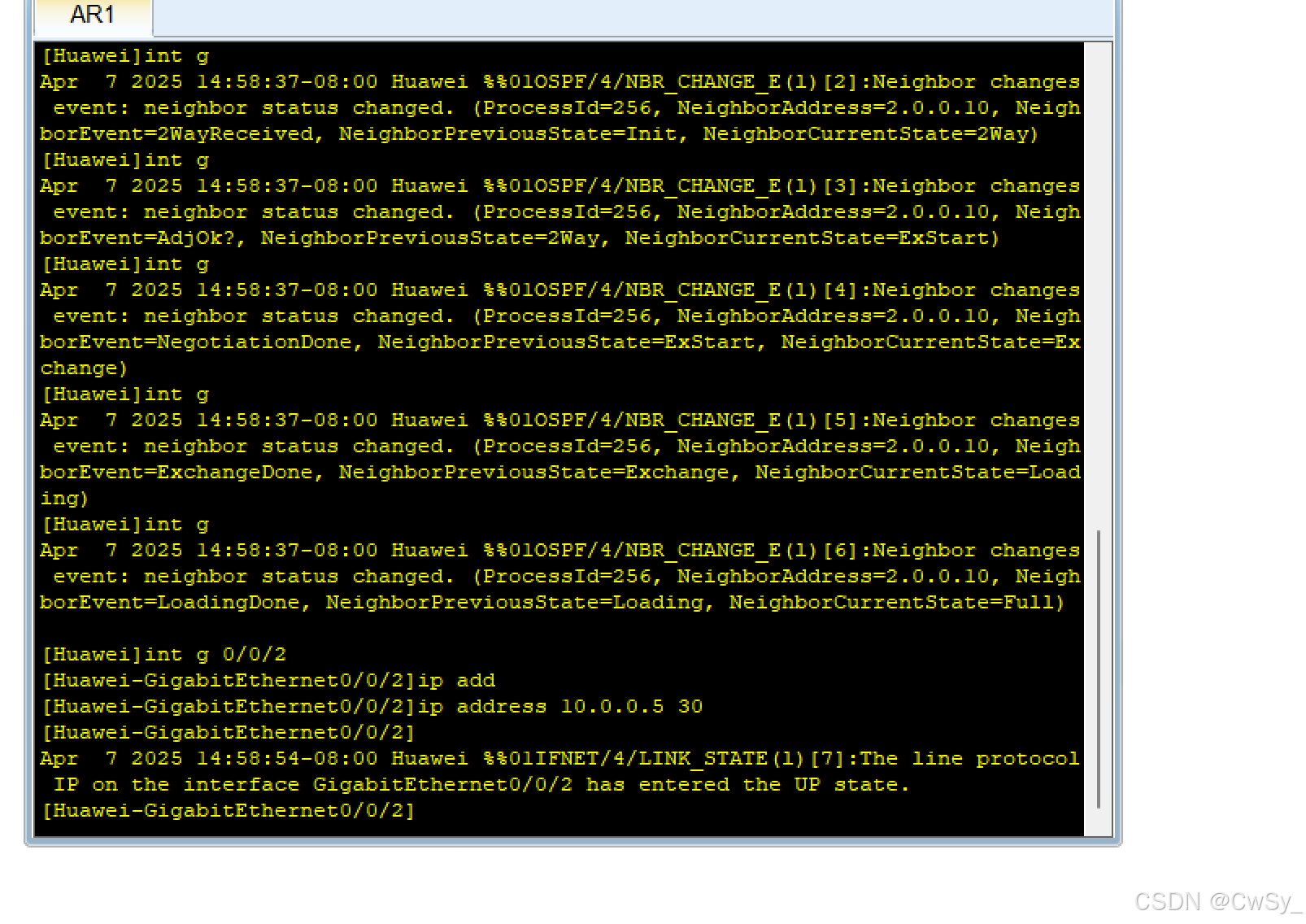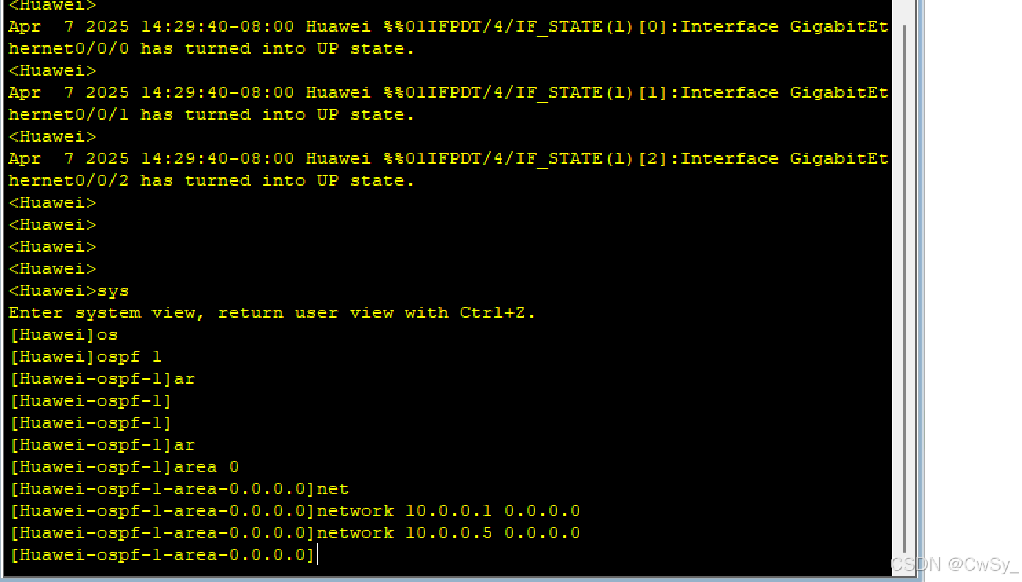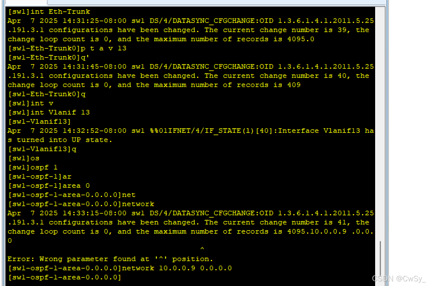 (6)SW1和SW2分别宣告对应的五个接口,AR1宣告两个接口。让四个Vlanif接口成为静默接口(接口不允许发送和接收OSPF报文)。在SW1和SW2之间的链路配置VLAN,并放通链路、宣告。