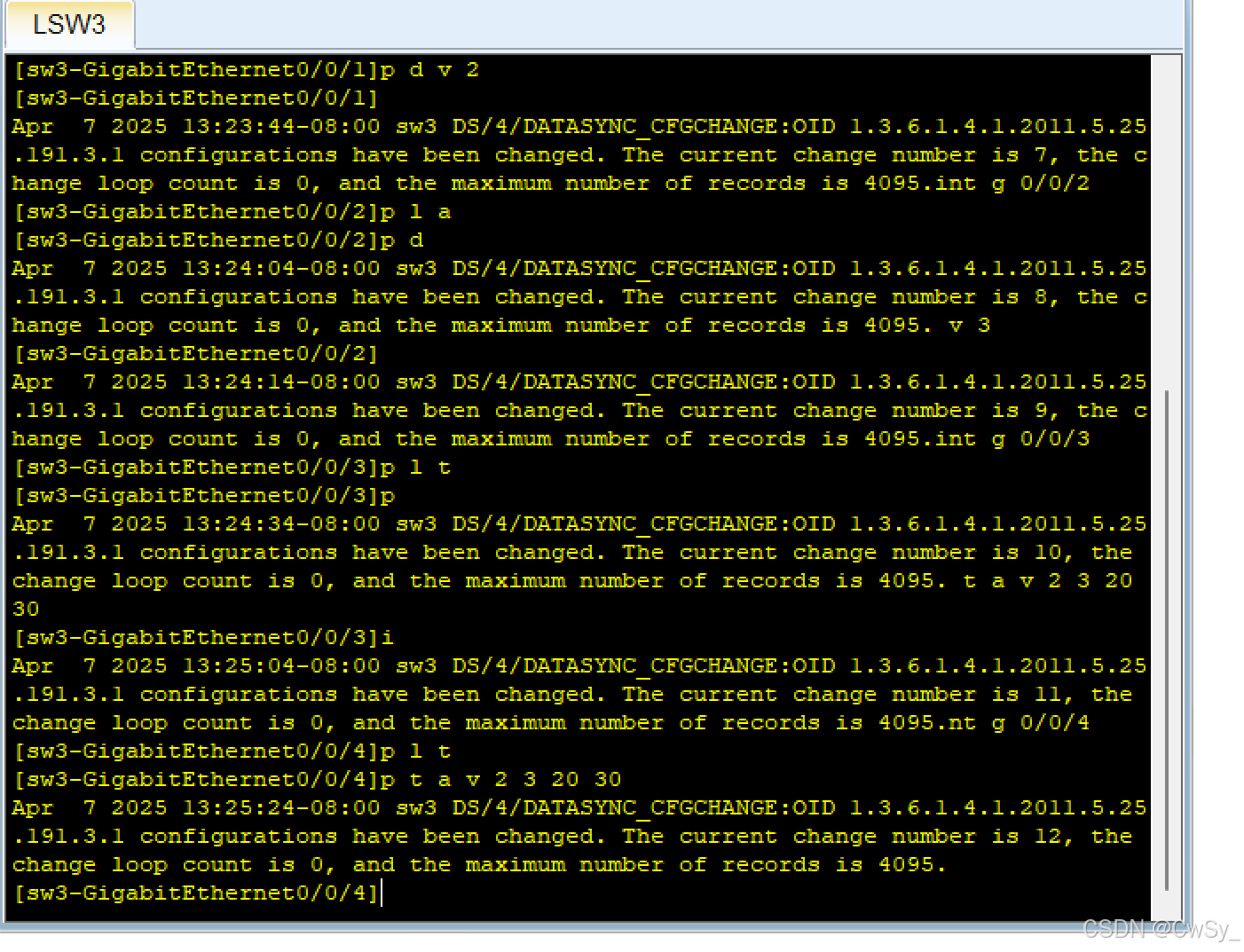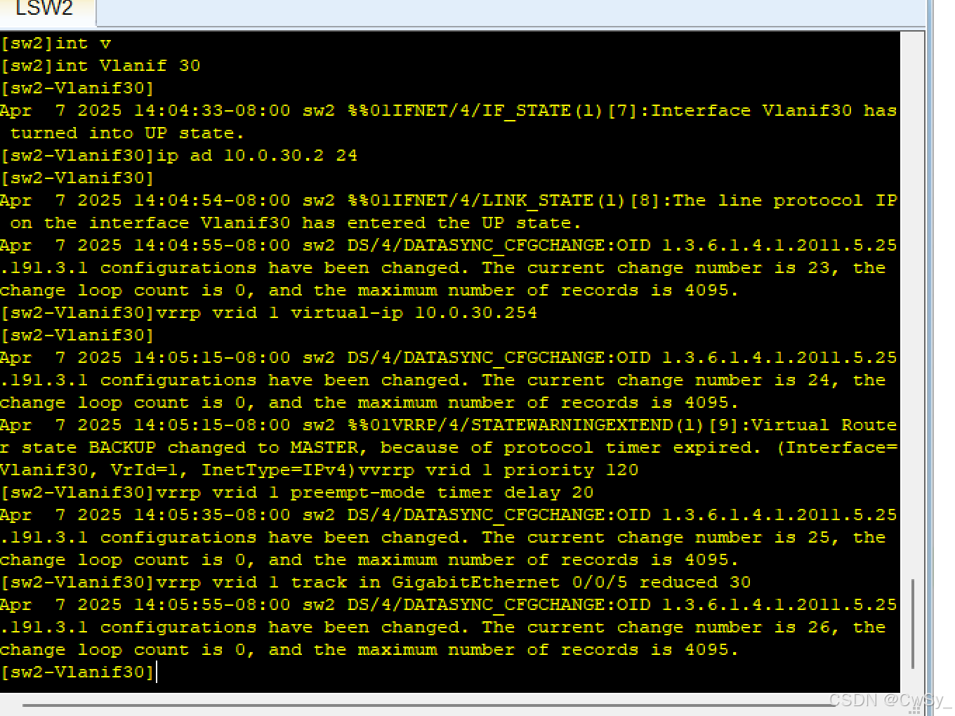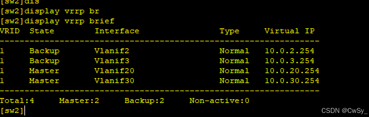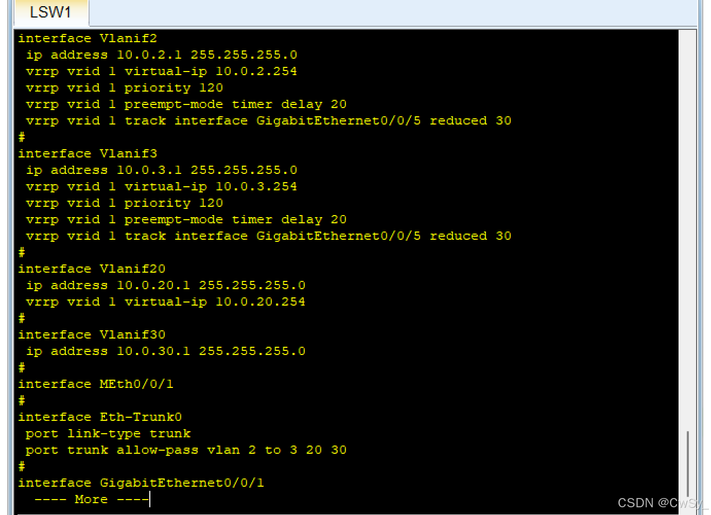 SW2中的VRRP配置与SW1相反,SW2是VLAN 2和VLAN 3的备份网关,是VLAN 20和VLAN 30的主网关。