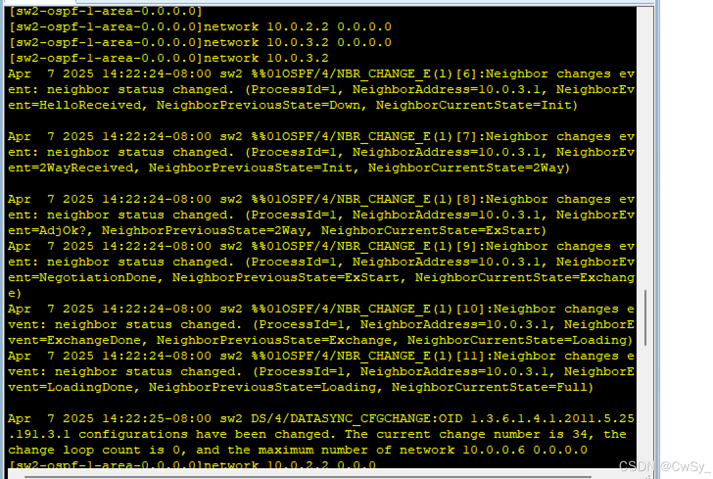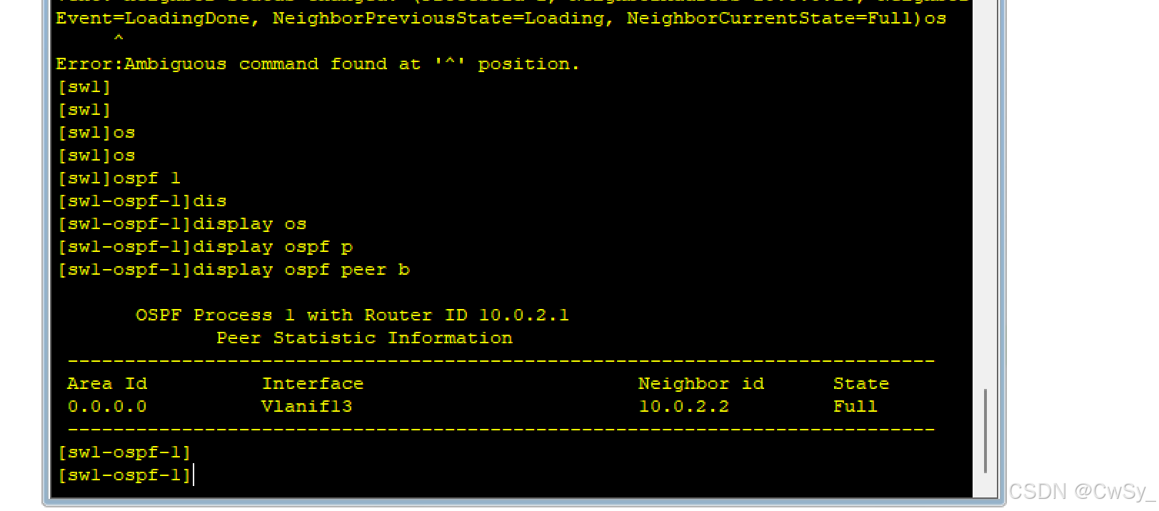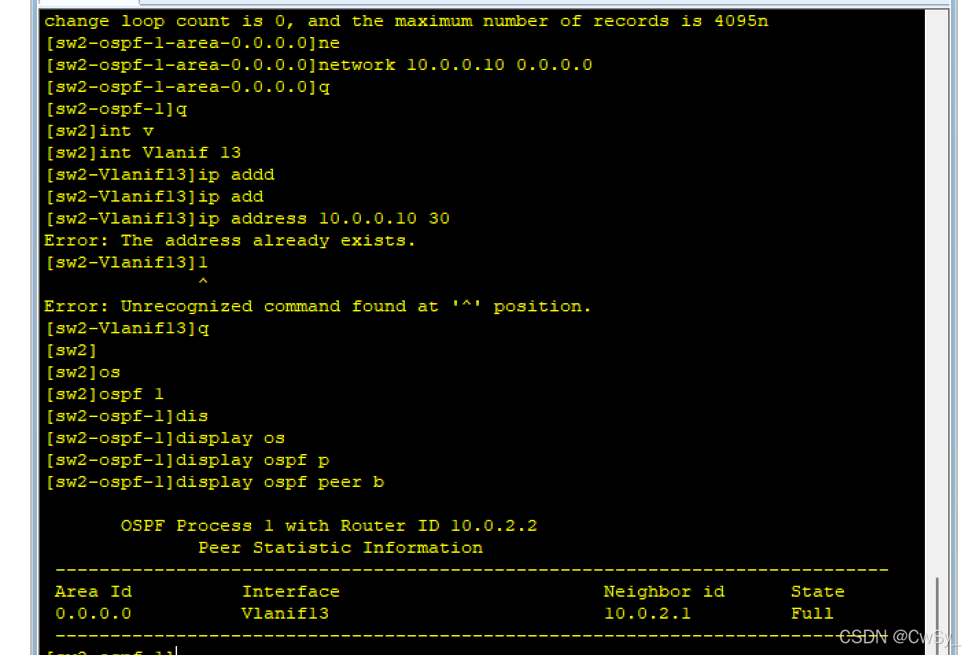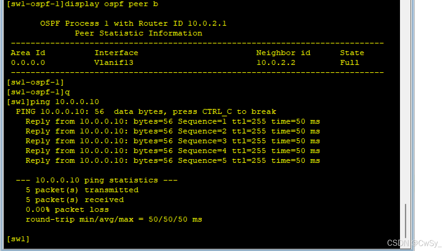 查看ospf表,并让SW1 ping SW2的Vlanif接口,检测连通性