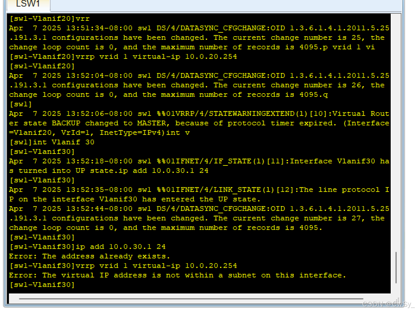 SW1成为VLAN 20和VLAN 30的备份网关,无需调整优先级、抢占延迟和上行链路监控。