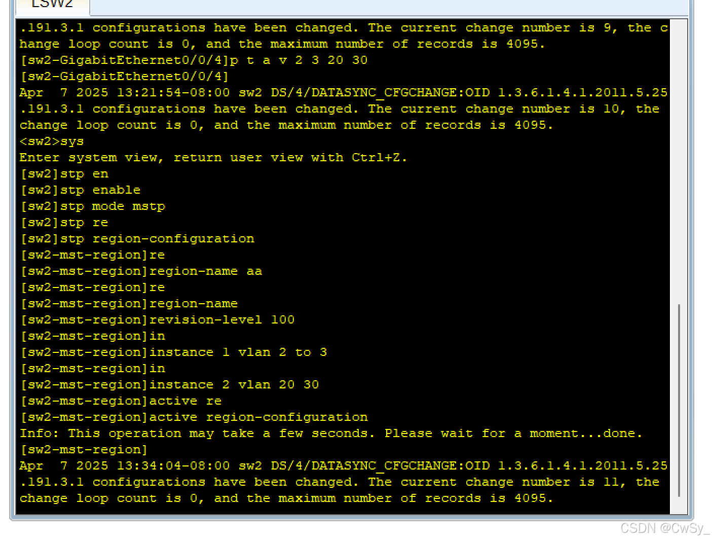 ②将VLAN 20和VLAN 30归为实例2,构造一棵生成树,使SW2为主根,SW1为备份根。