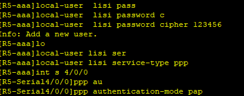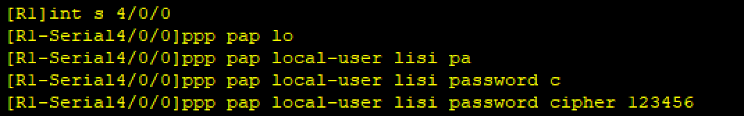 进入对应连接 R5 的接口,开启 PPP 验证,指定用 PAP 方式验证。