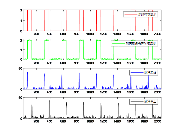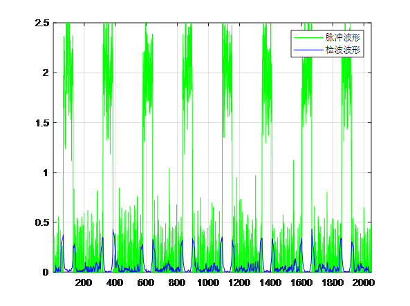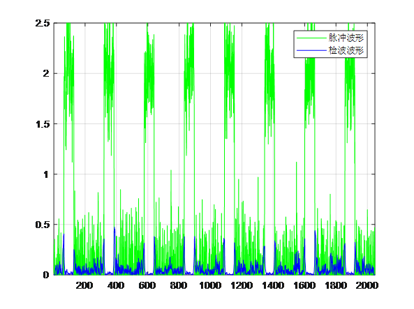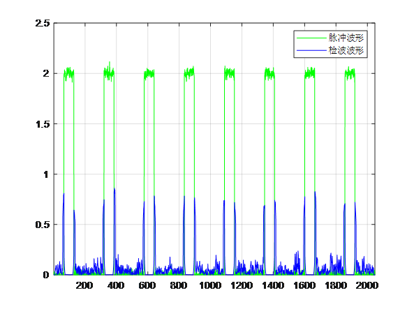如图3的仿真,通过能量检测的方法对信号进行检波处理,对信噪比有较高的要求,在信噪比低的情况下,可能会产生虚警。保持前述仿真各参数不变,降低信噪比到SNR=10;此时得到的脉冲与检测波形对比如图4所示,由于杂散较高,如果门限阈值选择不合适,在此信噪比下可能会产生虚警与测量误差。